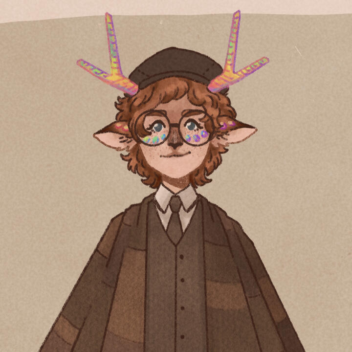 Markings: Cernunnos, like the animal he represents, has faun-like resemblance in his skin ; easy to spot the fade over the brow, 'cross the cheeks and shoulders, etc. He is dappled by old scars, inlaid each with fine shimmer to memorialize the victory.Distinguishing trait(s): Unlike his offspring, Cernunnos's ears are longer and much more obvious ; he has a longer tail ; sharper teeth, a much deadlier crown which connects at the center to signify his sirehood. Cernunnos, too, is speckled with crystals which scatter decoratively over his face, the backside, and the extremities. This particular shape is faun-like - having the torso of a man and the lower half of a deer.Apparel: Altogether, in a more natural environment, Cernunnos does not wear much clothing at all aside from a loin-covering or something similar. When mingling with humans he will wear typical male attire ; button-ups, blazers, trousers, vests, fine leather shoes, etc.Accessories: Always his staff ; the snake-resembling necklace hung 'round the neck, easily takes shape into the actual creature.